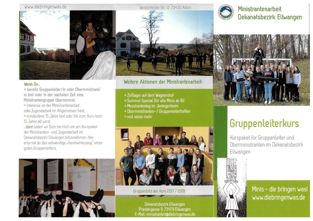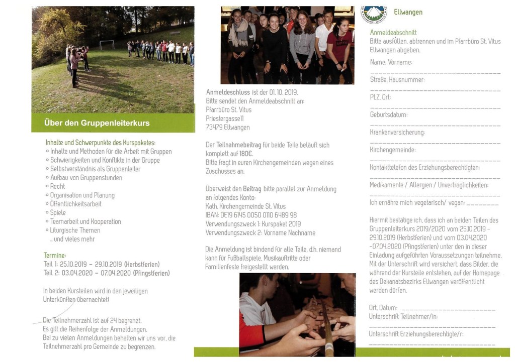Nach einem Jahr pause und unzähligen Anfragen bieten wir 2019/2020 wieder einen Gruppenleiterkurs des Dekanatsbezirks Ellwangen an! Alle Informationen können dem unten abgebildeten Flyer entnommen werden.